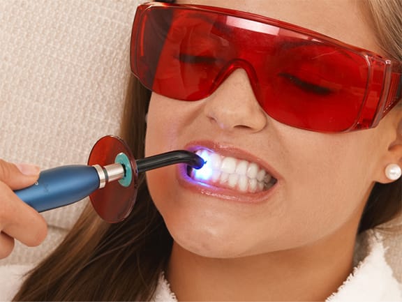 - Whitening - The whitening light is placed directly in front of your teeth to maximize exposure to the gel. The special light activates the gel which gently penetrates the outer-most (enamel) layer of your teeth; breaking up stains and discoloration during the process.
