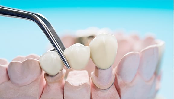 A bridge is made up of two or more crowns and is placed in gaps that may occur between your natural teeth. Your natural teeth are used as anchor or abutment teeth to which the bridge is attached. Bridges can be used to restore your smile and your ability to properly chew and speak and help in preventing your natural teeth from moving out of position.